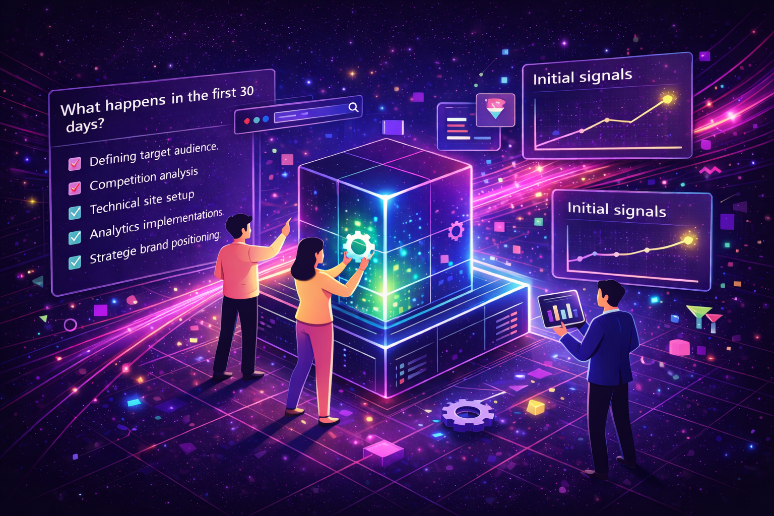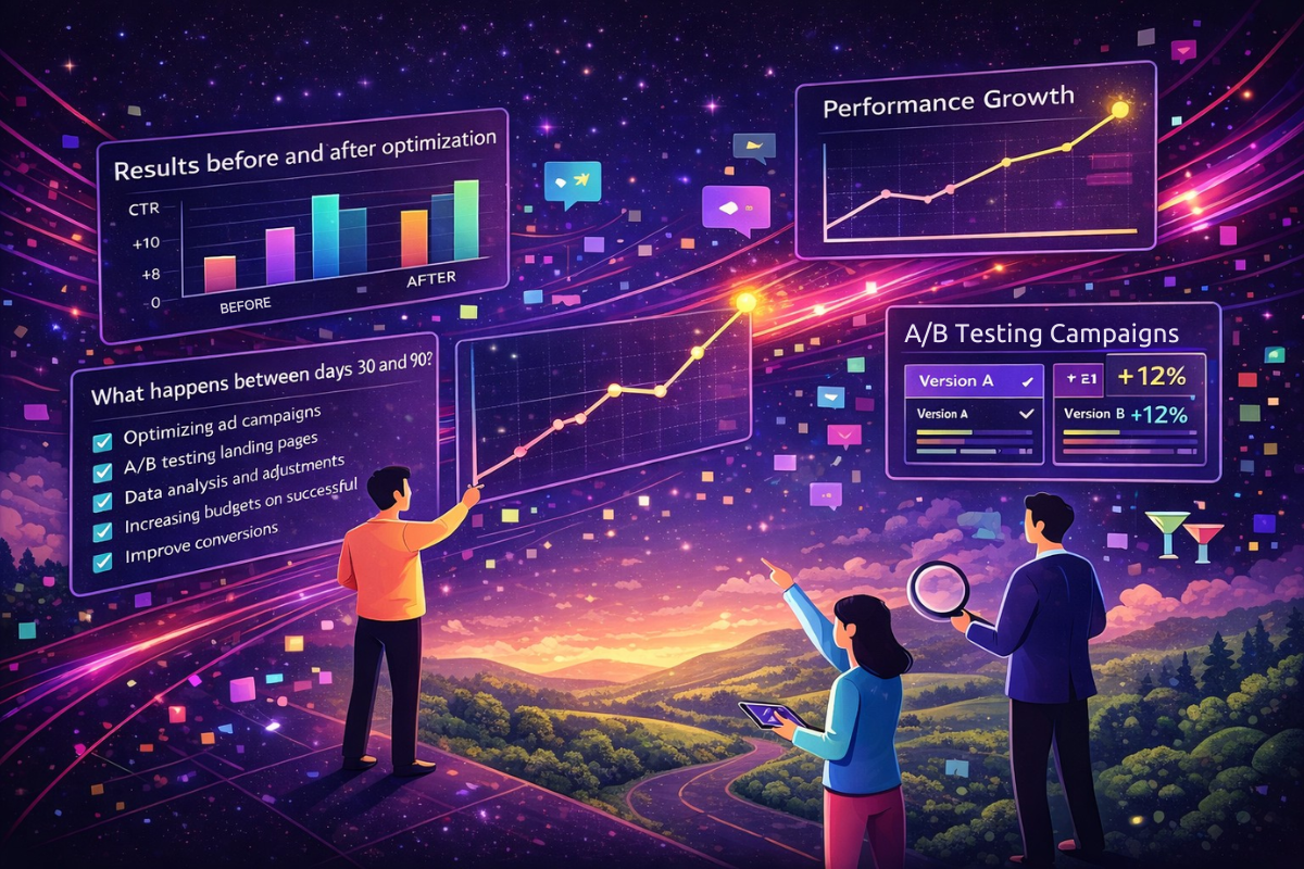 The second month is when activity becomes visible. Campaigns go live, content is published, and ads start running. Also, SEO optimizations are implemented. This is the “movement” phase.