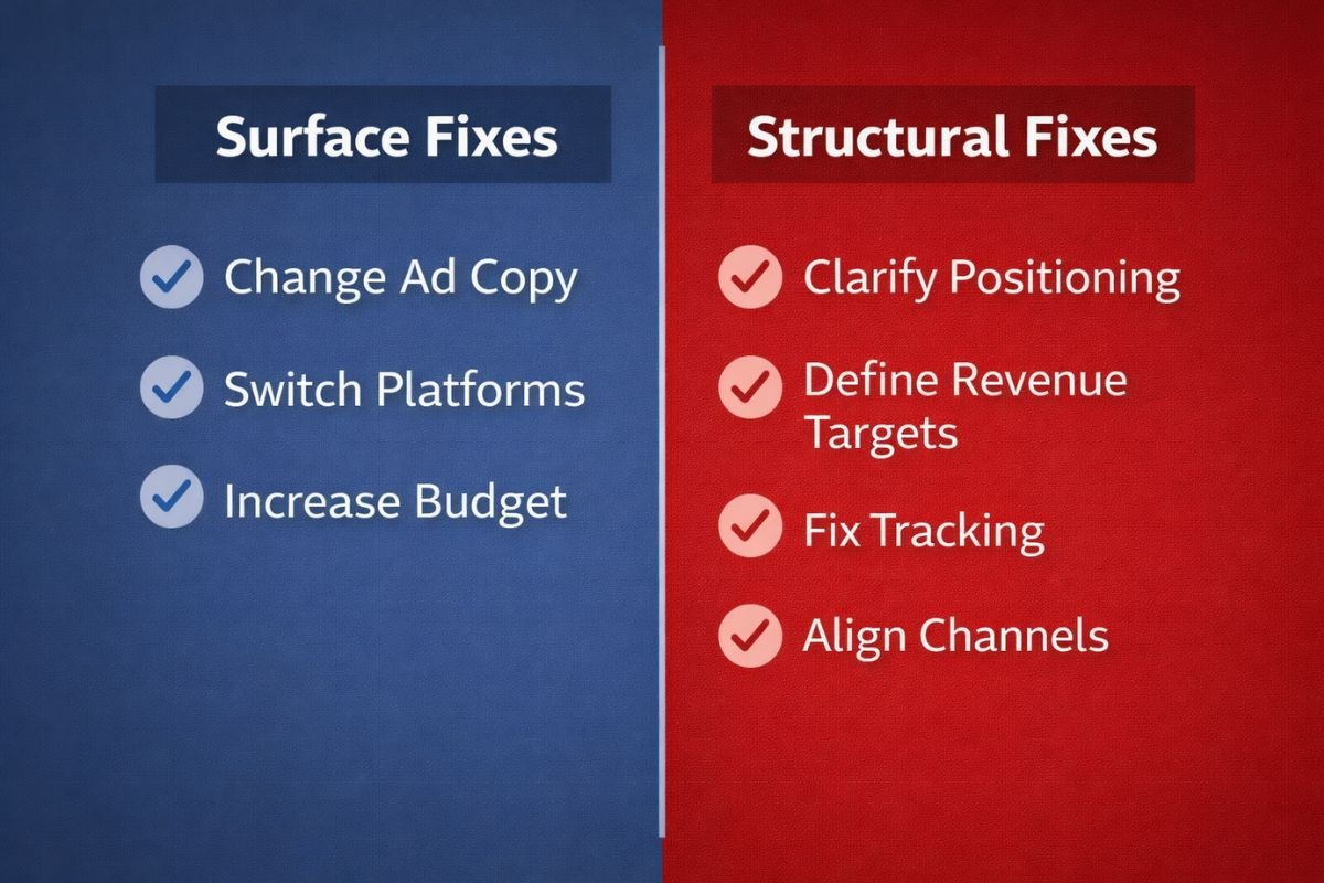 An insufficient ad can be rewritten, and a bad landing page can be redesigned. However, major rework is often what is needed to fix issues related to a lack of clear positioning, broken systems for tracking, and alignment amongst goals.